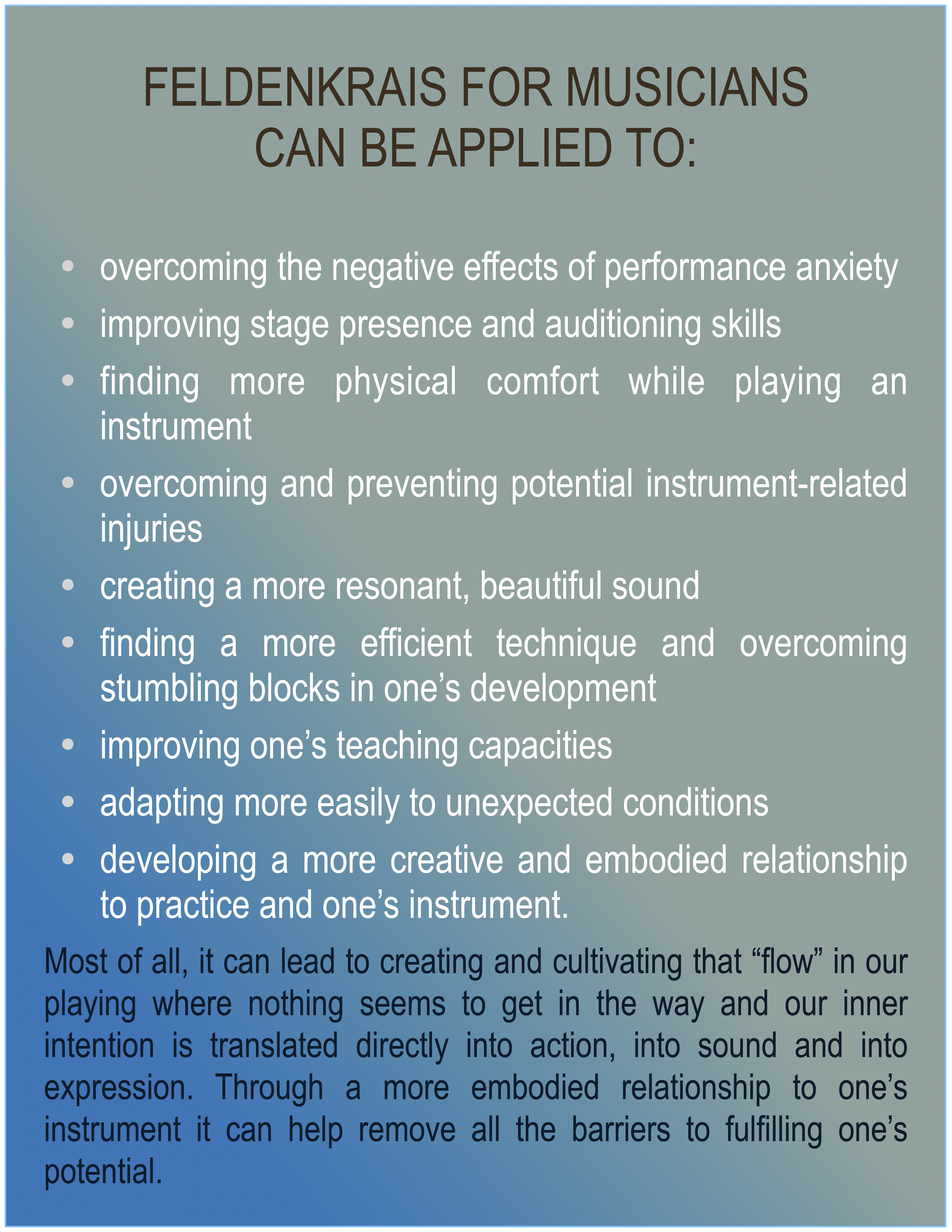 He has been offering and developing his Feldenkrais work with musicians for almost 20 years, teaching classes and workshops online, at universities, conservatories, conferences and festivals. He also offers individual lessons.